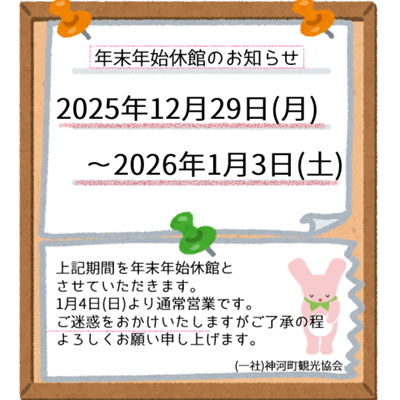 年末年始の休館日について【観光案内所】 年末年始の休館日についてのお知らせです☺️✨ 2025年12月29日~2026年1月3日まで 休館させていただきます。 休館中は、お問合せ・物販販売等の対応が出来ません。 ご利用のお客様にはご迷惑をお掛けいたしますが、ご了承の程宜しくお願い申し上げます。